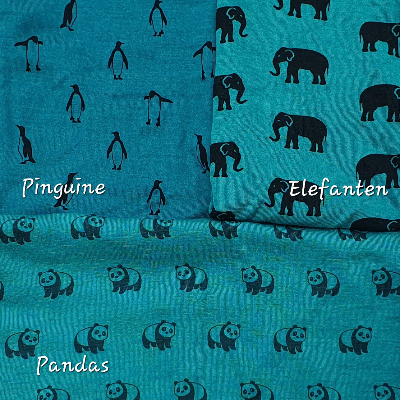 Da es zu den Pandas und den Elefanten keinen perfekt passenden Uni-Stoff gibt, wird mit den passenden Ringeln Kombiniert (siehe Beispielfoto).